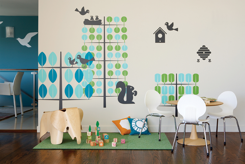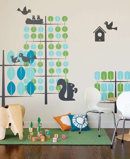 pour décorer et transformer radicalement une chambre d'enfant avec un décor contemporain composé d'arbres, de feuilles, d'oiseaux et d'un écureu ...