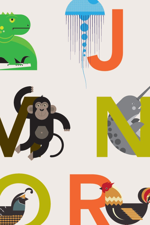 Antelope, Bear, Cow, Dolphin, Elephant, Frog, Goldfish, Horse, Iguana, Jellyfish, Kangaroo, Lion, Monkey, Narwhal, Octopus, Pig, Quail, Rooster, Sheep, Turtle, Urchin, Vulture, Walrus, X-Ray Fish, Yak, and Zebra.