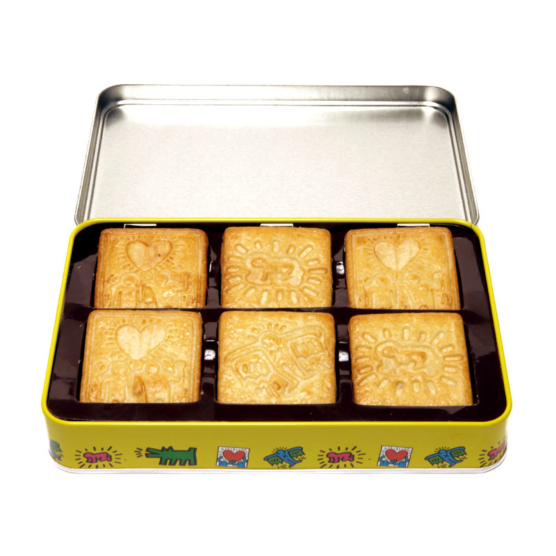 Découvrez cette jolie boîte rectangulaire en métal 'collector' imprimée avec des couleurs POP et les personnages les plus célèbres de Keith Haring. Cette boîte métal collector renferme des biscuits personnalisés à l'effigie des oeuvres les plus célèbres de Keith Haring