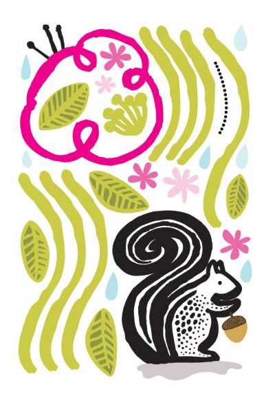 * un écureuil, deux grandes libellules, un oiseau, un petit ver de terre